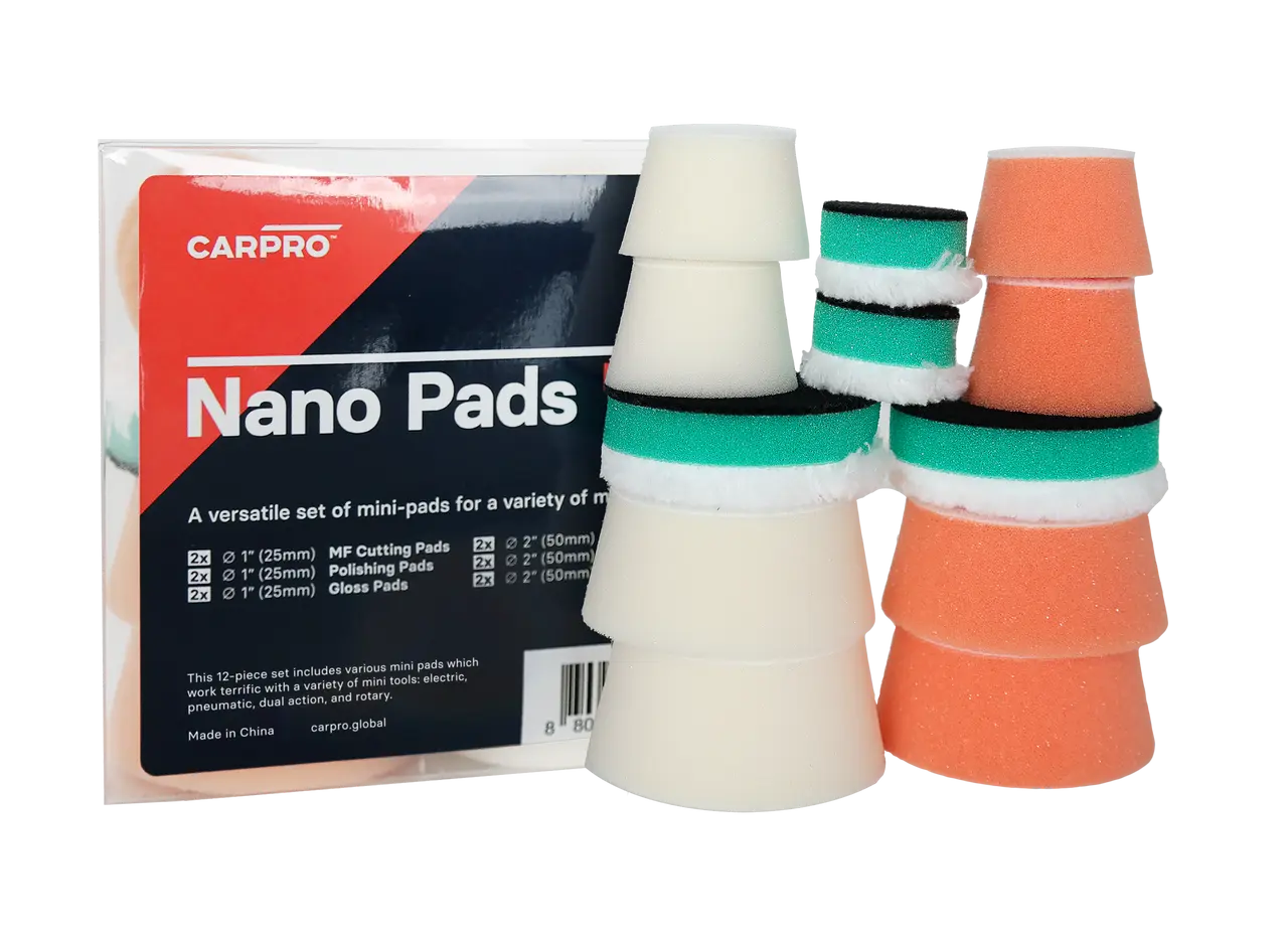 The CARPRO Nano Pad Kit has been reinvented for 2024! This 12 piece set includes (4) CARPRO Microfiber cutting pads, (4) CARPRO Polishing Pads, as well as (4) CARPRO Gloss Pads. The all new kit includes not only 50mm pads but 25mm pads as well! These nano pads work terrific with a huge variety of mini tools, both electric and pneumatic, dual action, and rotary!