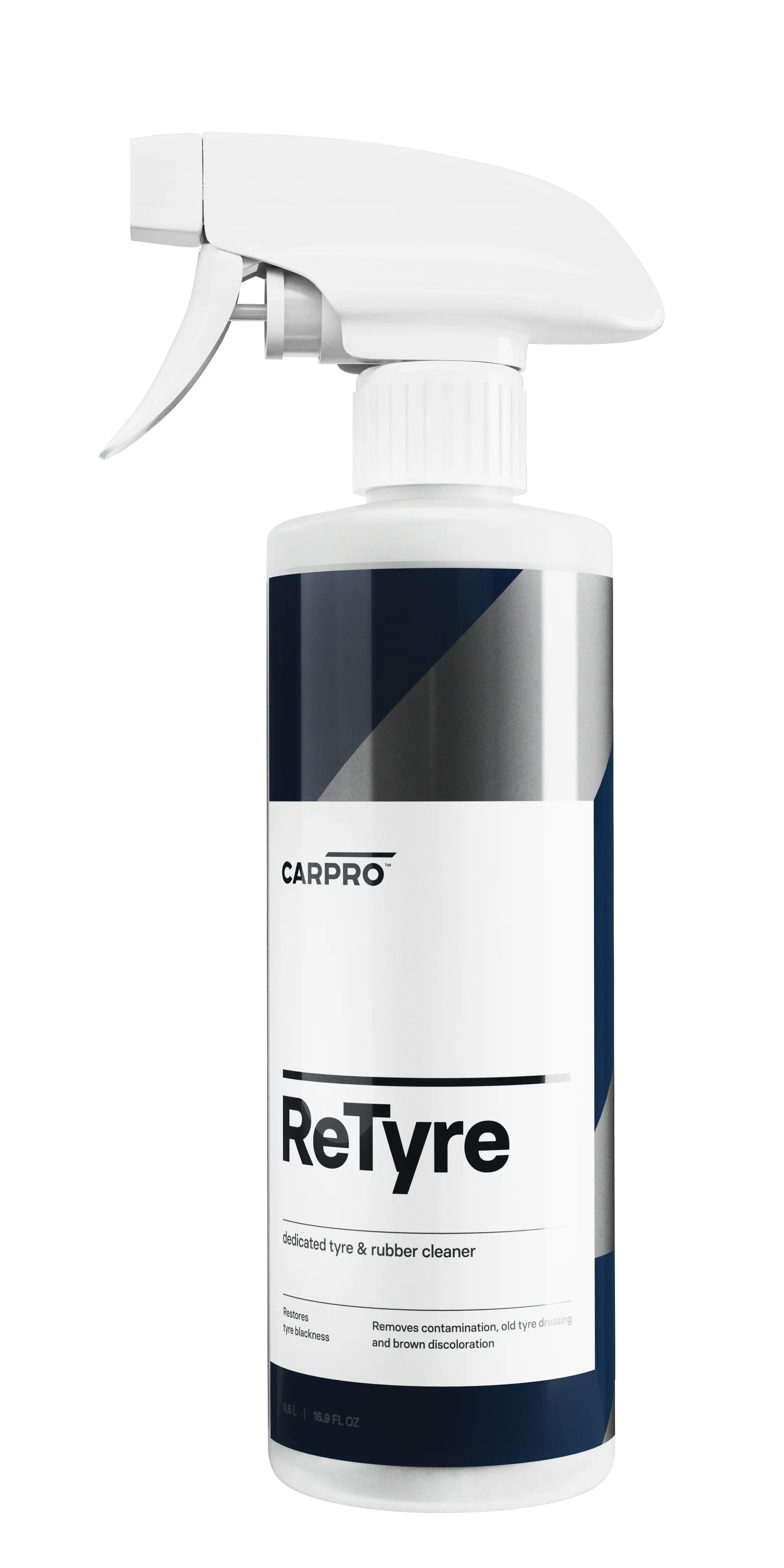 CARPRO ReTyre was designed from the ground up specifically for the easy cleansing of tires from accumulated tire dressings, road film, and browning antioxidants. ReTyre from CARPRO provides a sparkling clean new tire look and prepares the surface to apply BlackOut, Perl or your favorite tire sealant. Tire sealants, coatings, and dressings respond much better to a perfectly clean tire and in the case of CQUARTZ BlackOut it is absolutely imperative for a full bond!