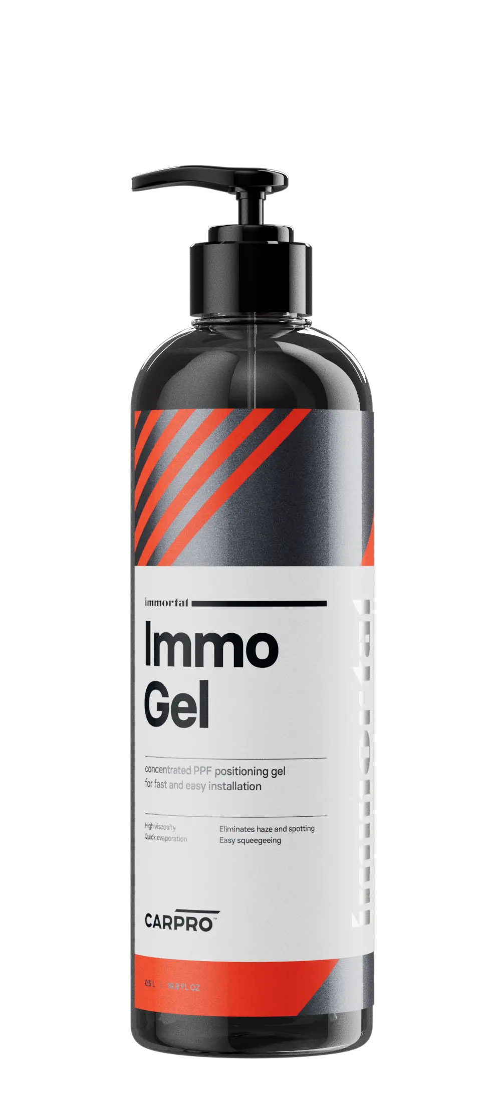 CARPRO IMMORTAL ImmoGel is our new Immortal-dedicated concentrated PPF positioning lubricant. When diluted and sprayed over the PPF adhesive, its high viscosity improves moisture distribution and therefore allows easy positioning and squeegeeing with minimised risk of haze or spots after application.